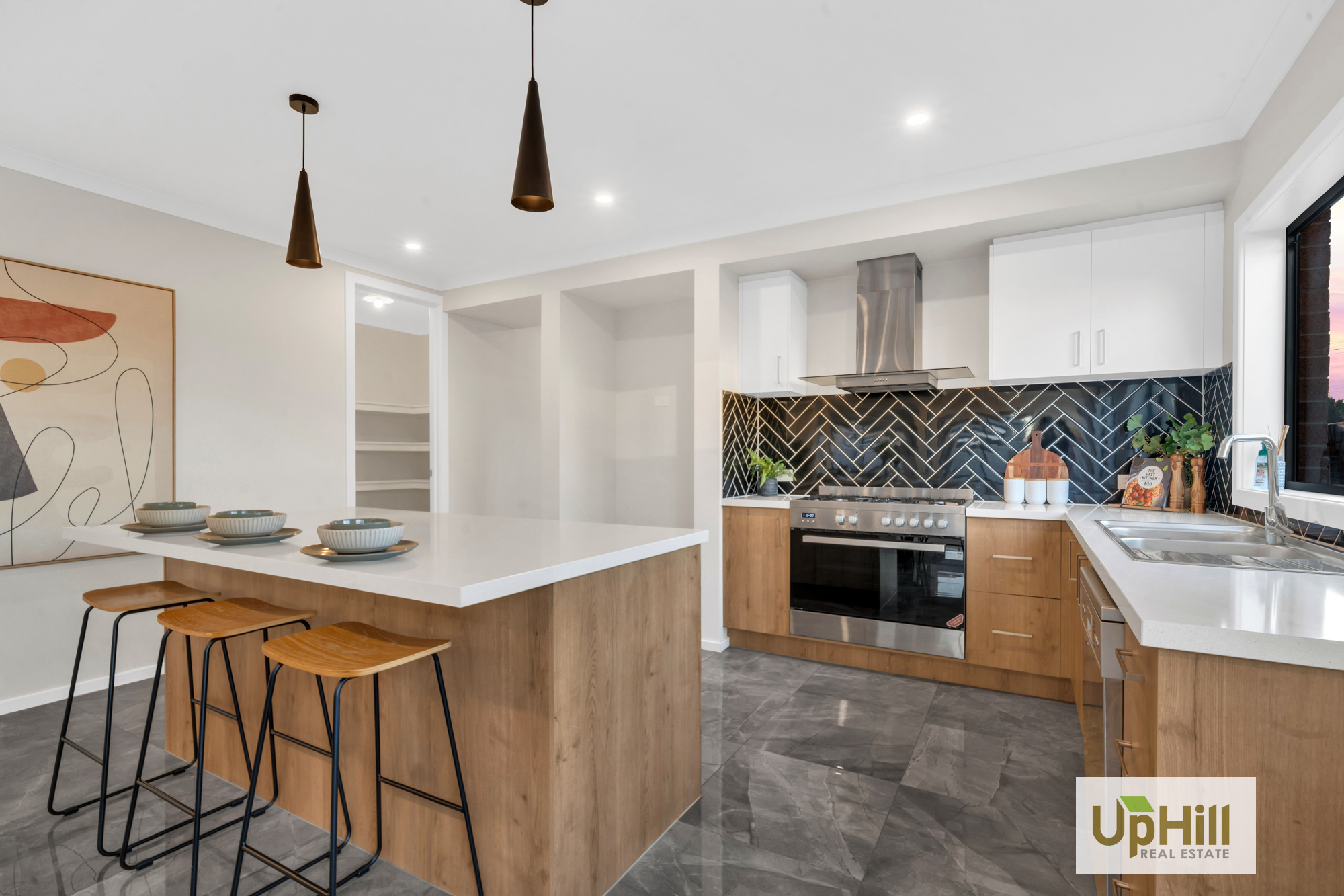 • Kitchen with Stainless Steel Appliances, Stone Benchtops and Walk in Pantry