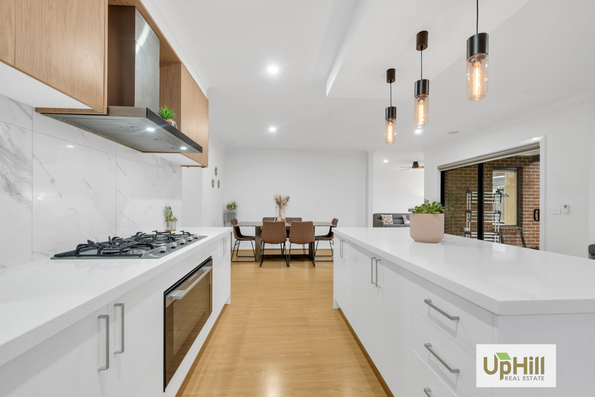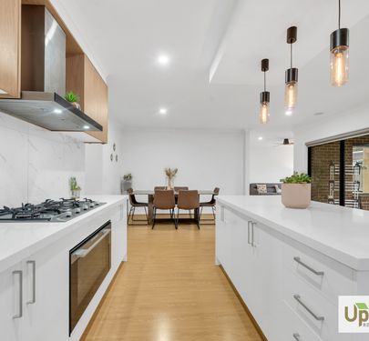 The highlight of the home is the entertainer's kitchen, equipped with high-quality stainless-steel appliances, stone benchtops, and ample storage. The kitchen seamlessly connects to a generous galley-style walk-in pantry and features an impressive island bench, making it an ideal space for culinary pursuits.